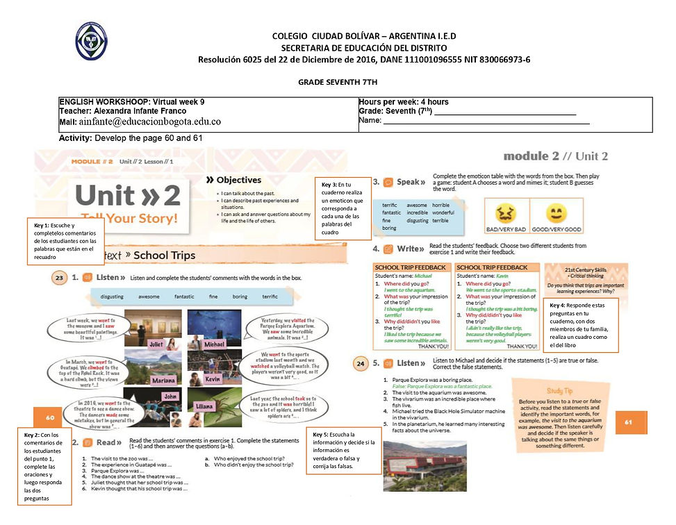 1. El trabajo del libro debe se desarrollado en el libro o en el cuaderno según las indicaciones dadas en la guía. (page 60-61)